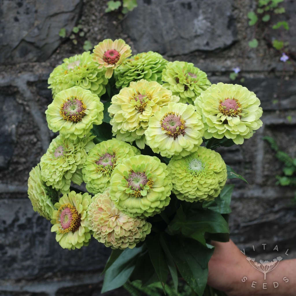 This is a diverse breeding population derived from a cross between Dazzling Blue Kale and Beni Houshi Mizuna. We found the first individual of this cross between where the two parents had been flowering. These seeds are from the F2 generation which means the second generation after the original cross happened. There is a beautifully diverse mix of quite round leaves, and very feathery and frilly leaves and everything in between.