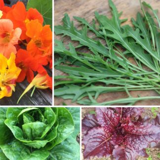 An eclectic mix of delicious and delicate leaves for making wonderful salads year round. If every meal was accompanied by a salad, the world would be a better place. It’s so good to eat some fresh raw green every day.