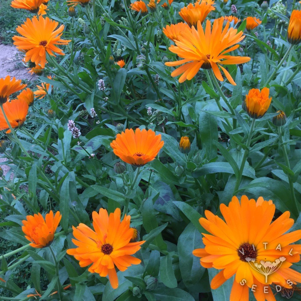 Also known as ‘Pot Marigold’. This is the classic calendula, producing abundant large orange blooms over a long season. We love calendula and would never go a season without it. It is really easy to grow and loved by humans and insects alike. There is something magical about finding bumblebees sleeping in calendula flowers early in the morning. The flowers are edible and make a great addition to salads. The petals have good medicinal properties and can be taken as an infusion in hot water or turned into a powerful tincture. Calendula’s medicinal actions include but are not limited to: anti-inflamatory, astringent, vulnery, and anti-microbial.