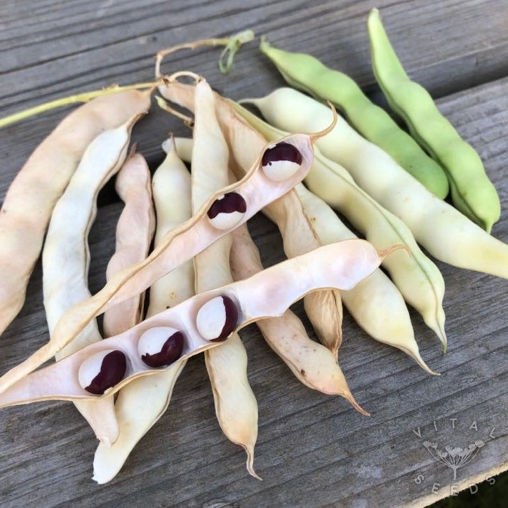 Stringless flatish pods followed by plentiful fresh beans that turn maroon and cream once dried. This pretty heritage variety of bean has been passed through the weathered hands of generations of gardeners since the 16th century. It’s the ultimate all-rounder providing plentiful flat smooth skinned green pods. As the pods fill out with beans and dry they develop a delightful maroon and cream pattern, great for long storage and comforting winter stews. An easy to grow climbing bean with great drought tolerance and plentiful abundance.