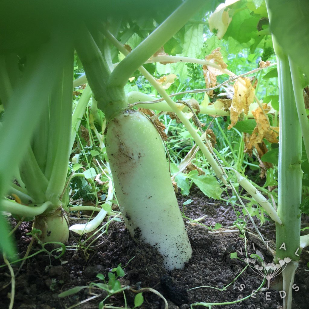 From seed, they take around 50-60 days to fully grow, but younger plants can be harvested to thin out the rows. Harvest like any other root crop, by pulling gently on the leaves and top of the root. Larger Daikons may need wiggling slightly to loosen them from the soil.