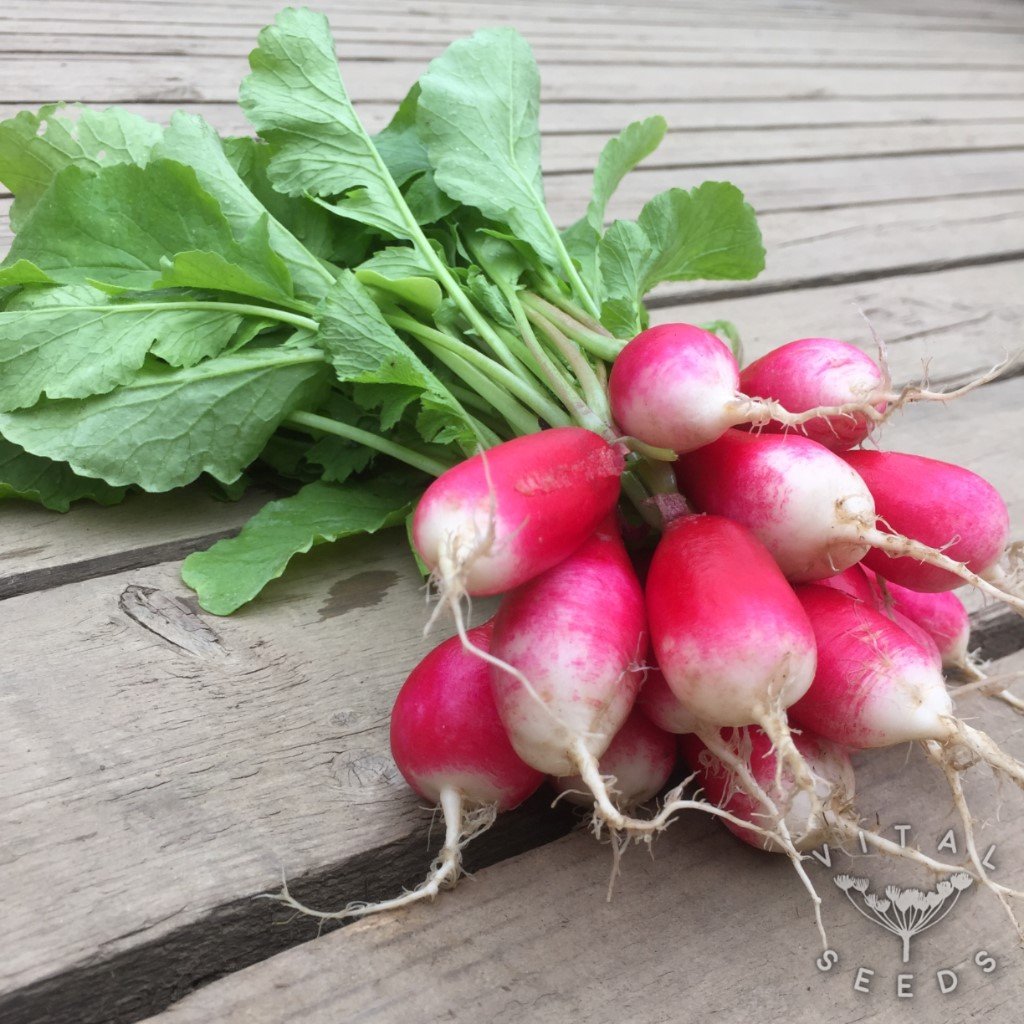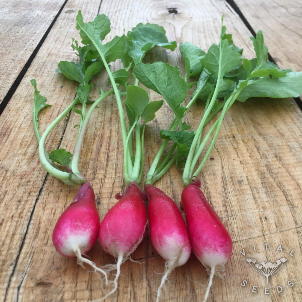 Scarlet colour with white tips and a crisp mildly pungent flesh. If you were to eat a radish for breakfast, this would be the one. Cute in looks, sweet and mildly pungent in taste and with a succulent crunch, it makes a tasty healthy snack. Introduced in 1879 it became a seller on the Parisian markets and quickly spread around the world.