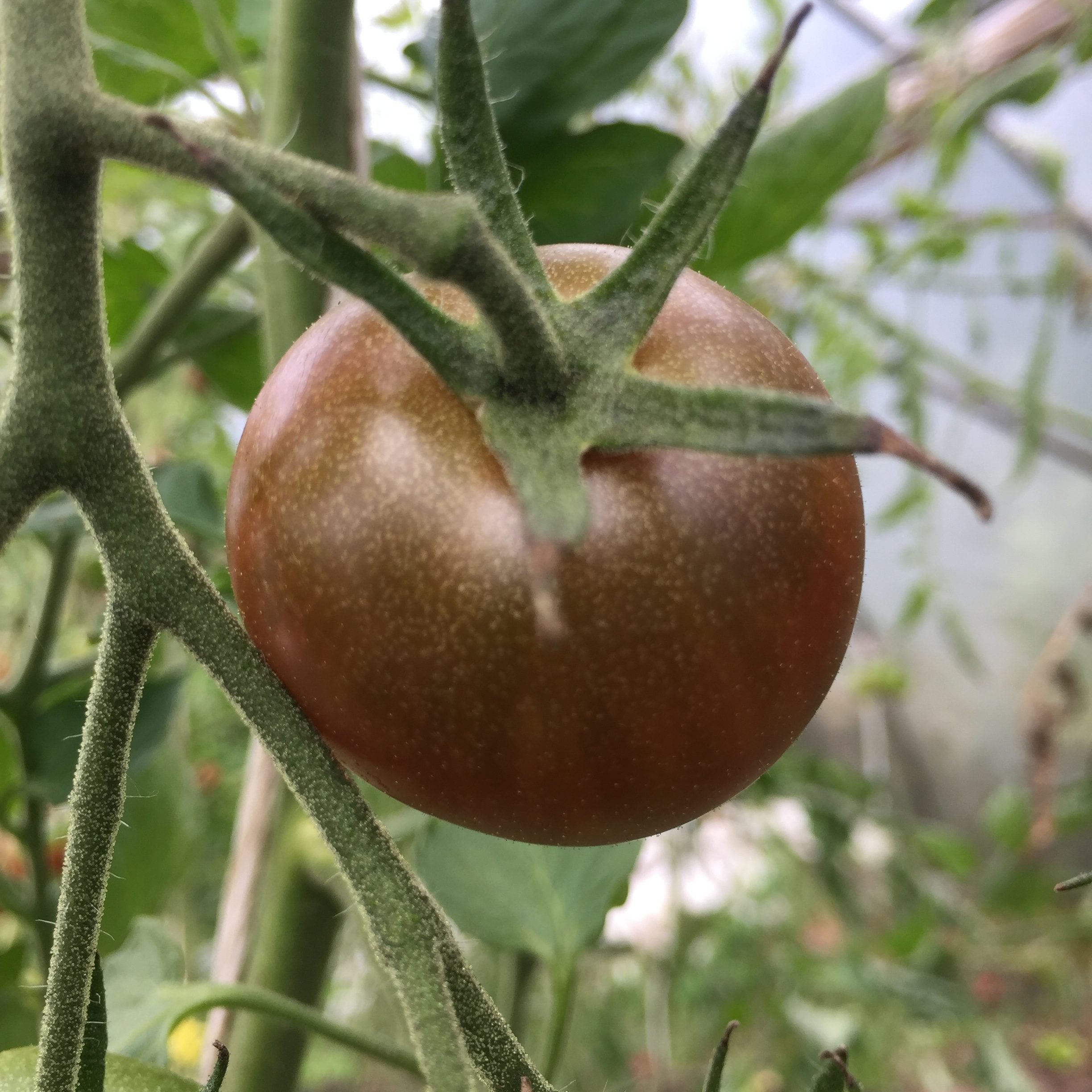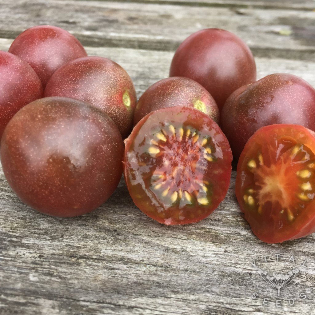 Vigorous indeterminate cherry tomato producing large trusses of inch round dark red fruits. They have a superb flavour, not too sweet, not too acid and are very juicy in texture. They have an amazing colour which is the result of a natural mutation discovered by the legendary tomato breeder Vincent Sapp of Tomato Growers Supply in 2003.