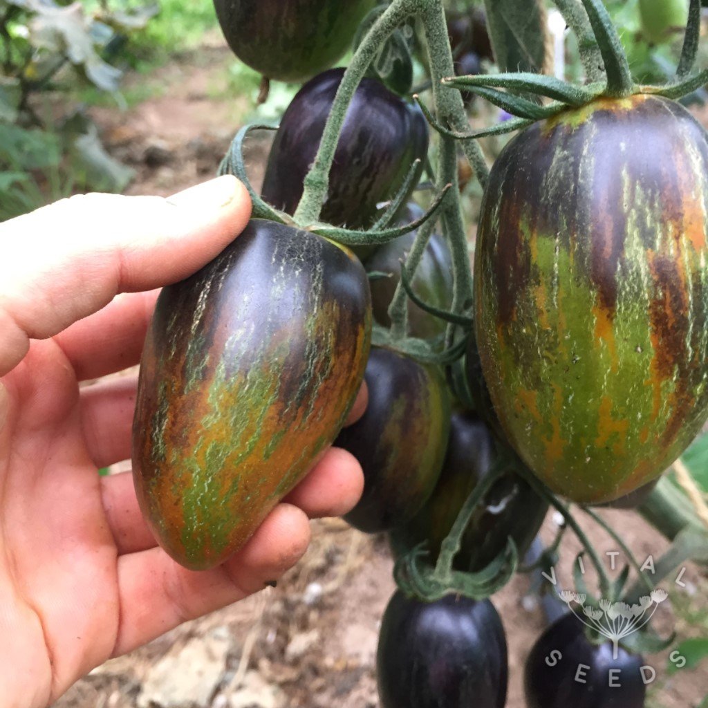 Indeterminate cherry tomato with multi-coloured elongated fruits of a delicate sweetness. What a tomato! It has crazy colours ranging from green, purple, black to orange and red. They are of a large grape to plum size, slightly elongated with a pointy tip. The fruits hold quite well on the vine and after harvesting without splitting. It is one of the best tasting tomatoes that we grew in 2020. Just make sure they are ripe when you harvest them, indicated by a colour change towards orange or red and a softness to touch.
