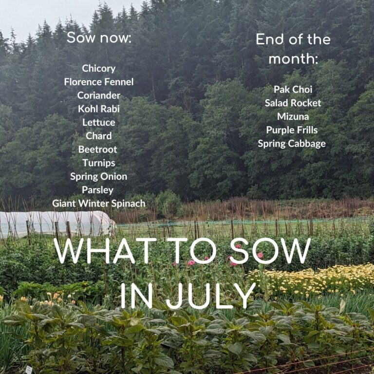 Don’t forget that you can keep sowing throughout the summer months, not only to create a succesional harvest of vegetables (e.g. French beans for a late crop in September) but also to start growing your winter veg that will supply you with valuable crops throughout the colder months and into spring.